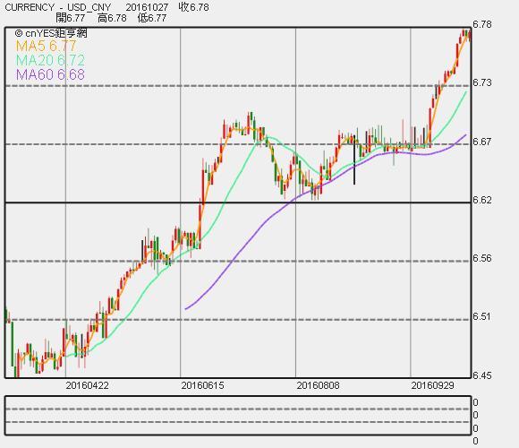 離岸人民幣再創新低 跌破6.79關口 ( http://news.cnyes.com/20161027/20161027124628000372963.shtml )27 Oct 12:55 PM 中國央行旗下媒體再喊話,表示人民幣對美元進一步貶值空間不大。不過周四跌勢仍未停止,離岸人民幣兌美元