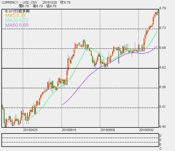 離岸人民幣下挫直逼6.8關卡 官員表態已無貶值空間 ( http://news.cnyes.com/20161028/20161028121208000257042.shtml )28 Oct 02:20 PM 人民幣今天中間價再創 6 年低點,離岸價格一度逼近 6.8 關卡,官員們不願見下跌預